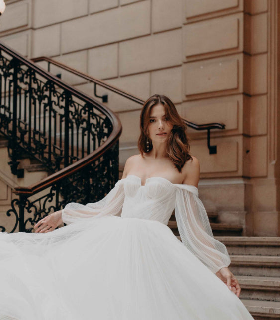 DESCRIPTION: Enhance your bridal look with the Alena Leena Bridal Armeria Sleeve. These detachable sleeves, designed by Halo and Wren, add a romantic and dreamy touch to any gown with their bishop style and ivory pleated tulle. Create a unique and stylish look for your special day.