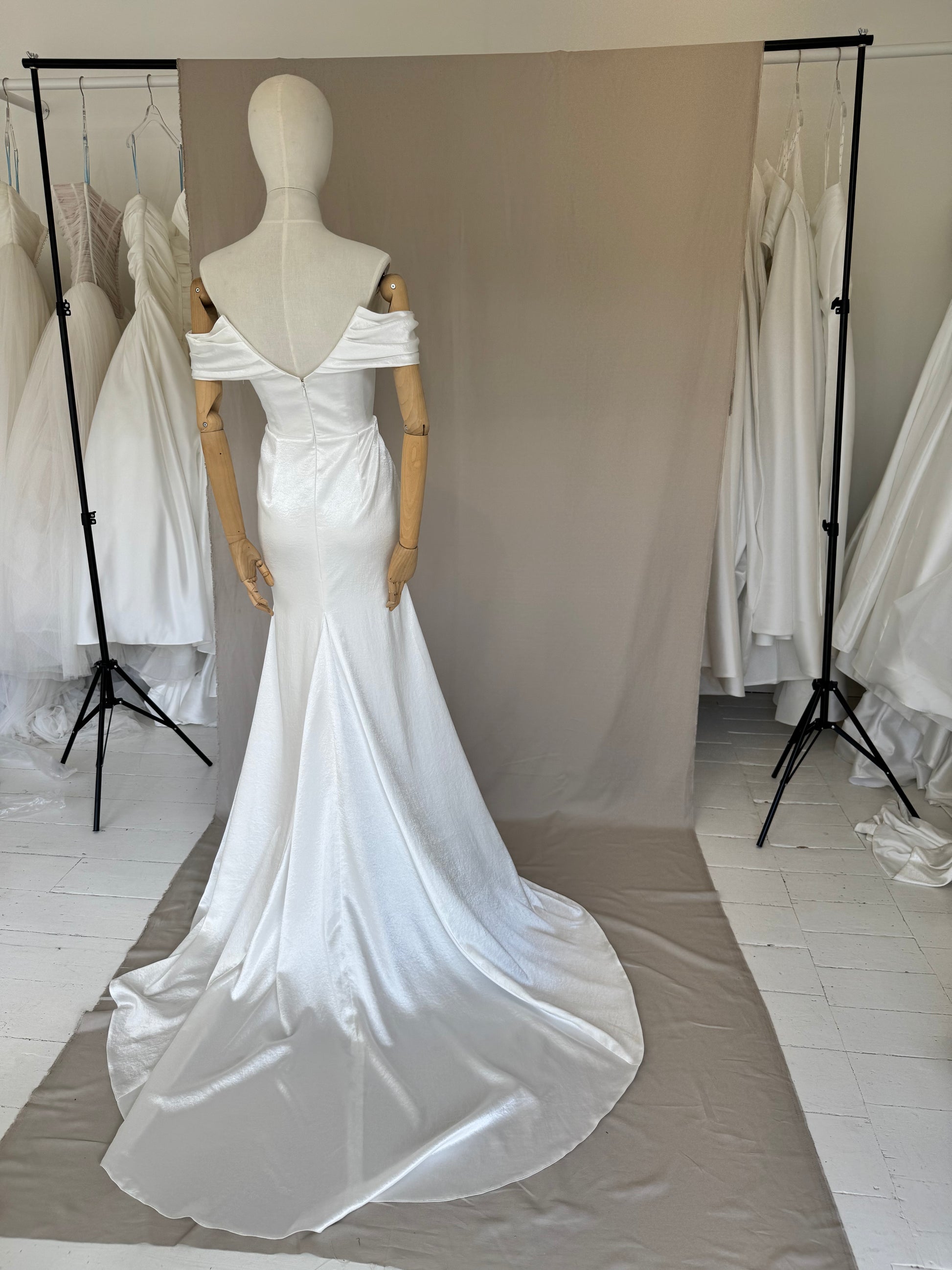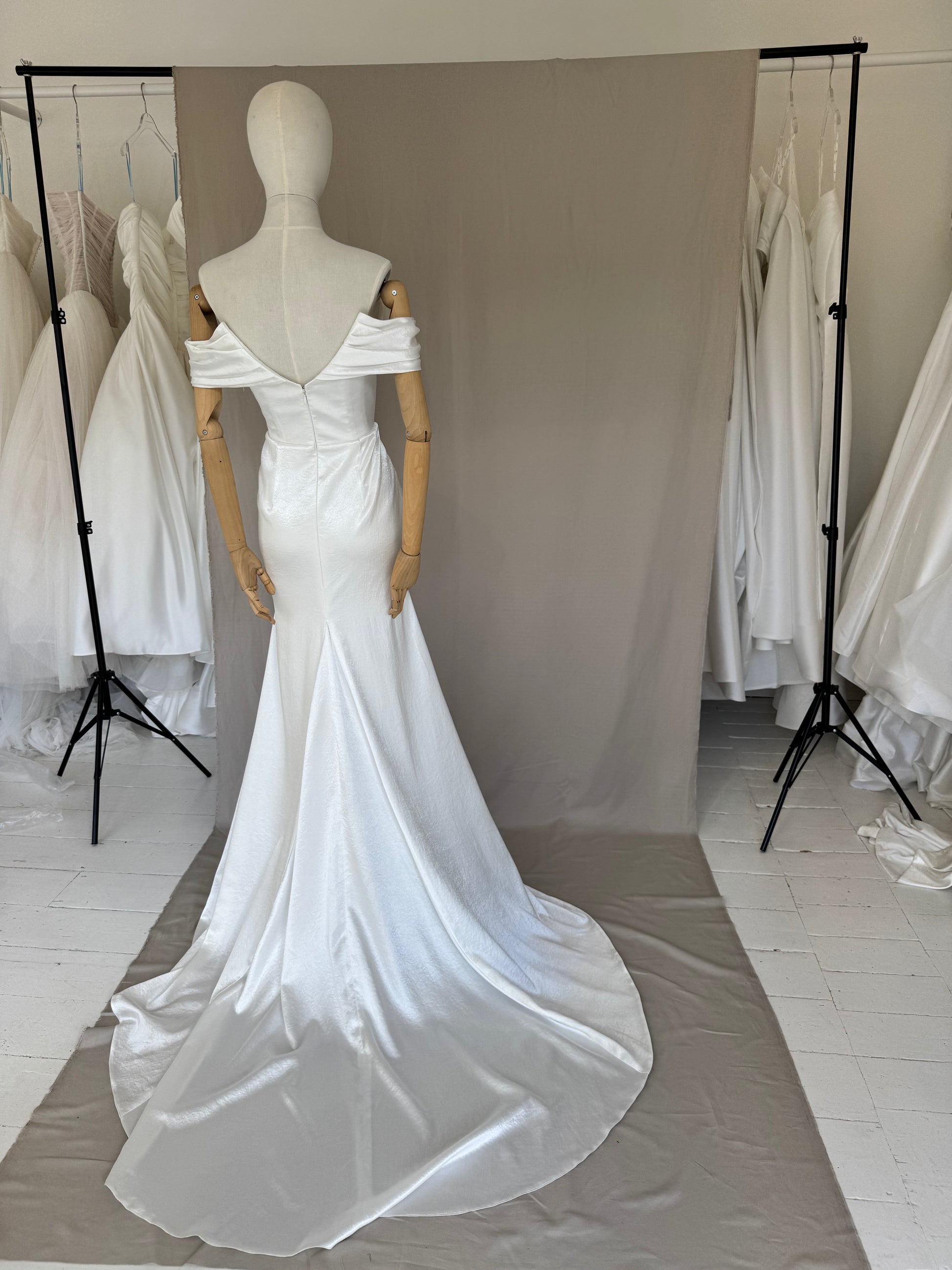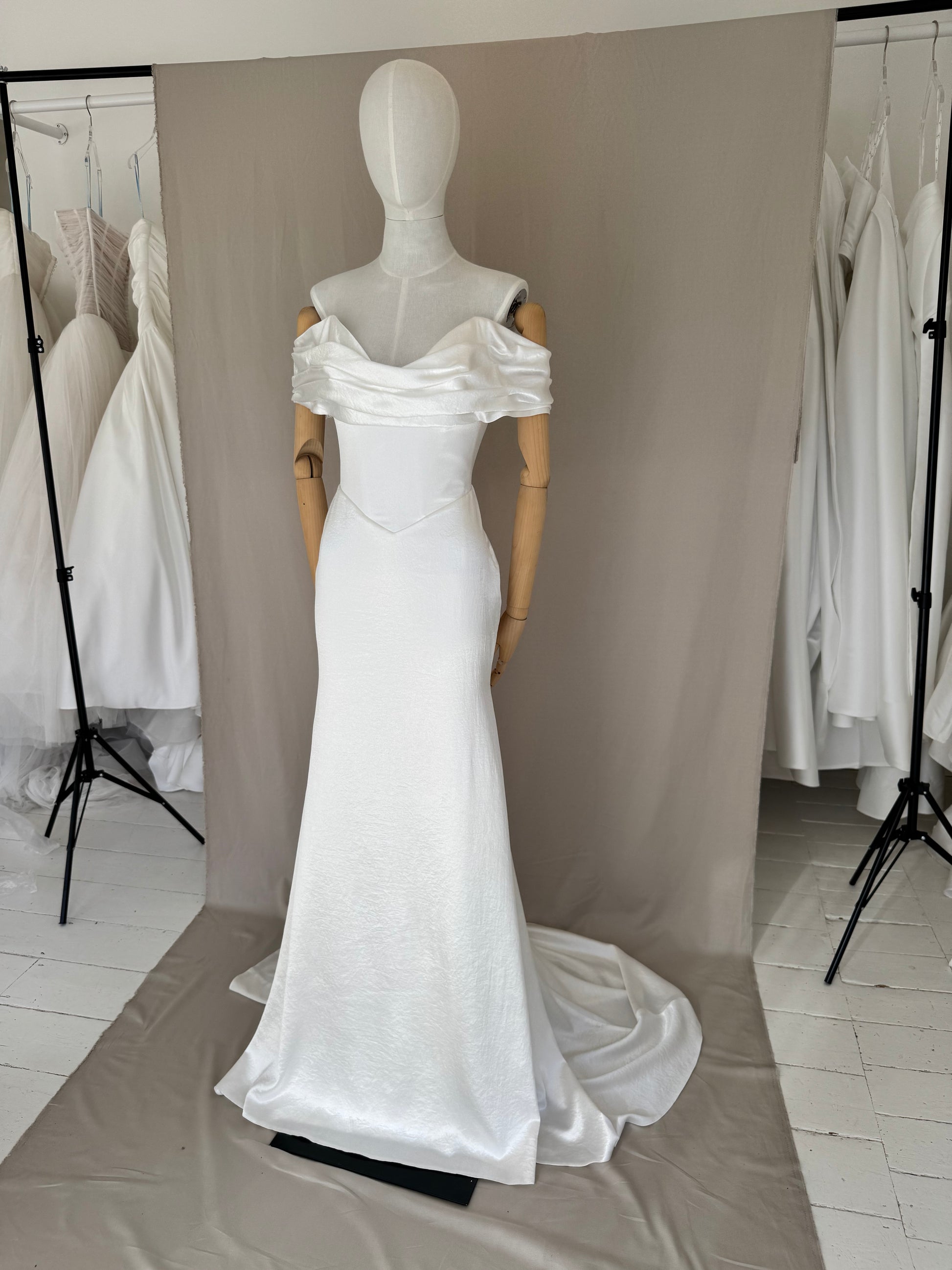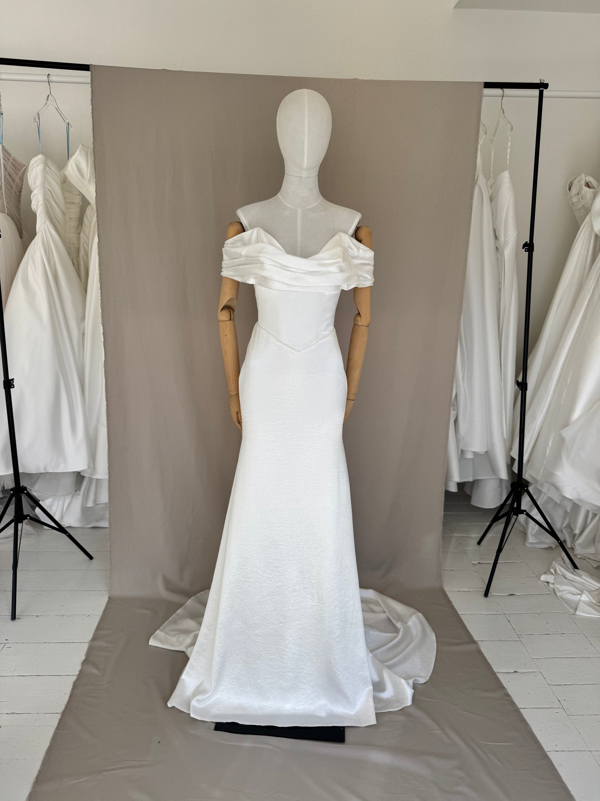 Minimalistic Gown crafted from the softest liquid crushed satin. The sharp neckline echoes the dipped waist of the seamless corset, elongating the figure. Artfully shaped bardot sleeves drape around the shoulders, adding a touch of effortless cool.