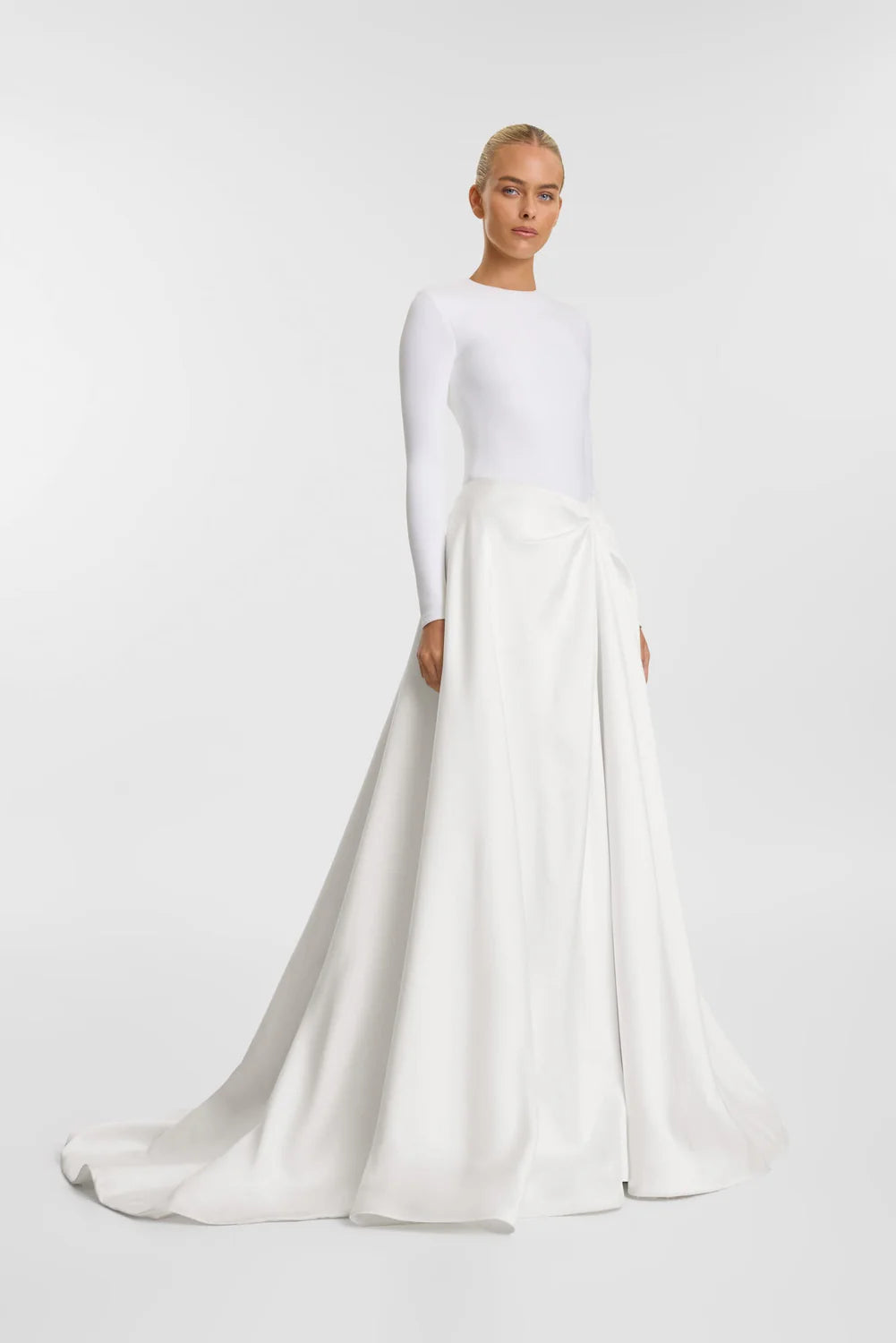Laying low in Arly, the Y2K-ready low-waisted skirt. Crafted from a luxe and luminous duchess satin, Arly brings a nod-to-the-noughties refresh to a ballgown aesthetic. The soft A-line skirt, which sits effortlessly at the low waist, is finished with a drape detail at the asymmetric dipped waist. Arly is available with or without a split.DETAILS: