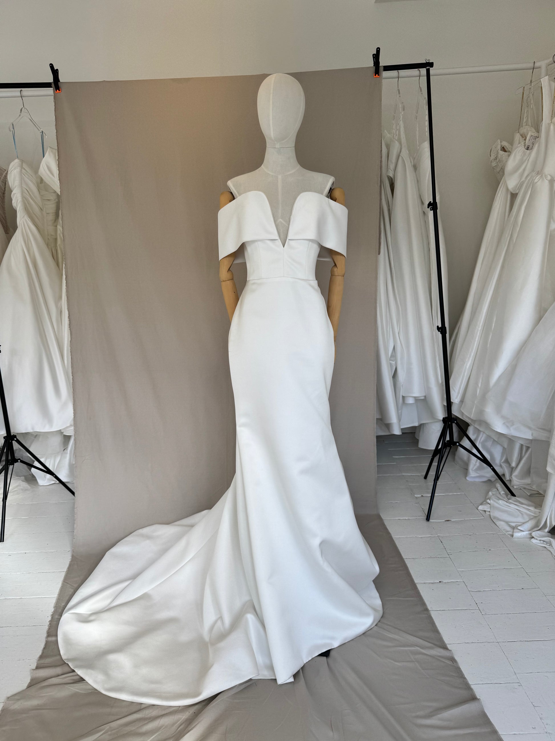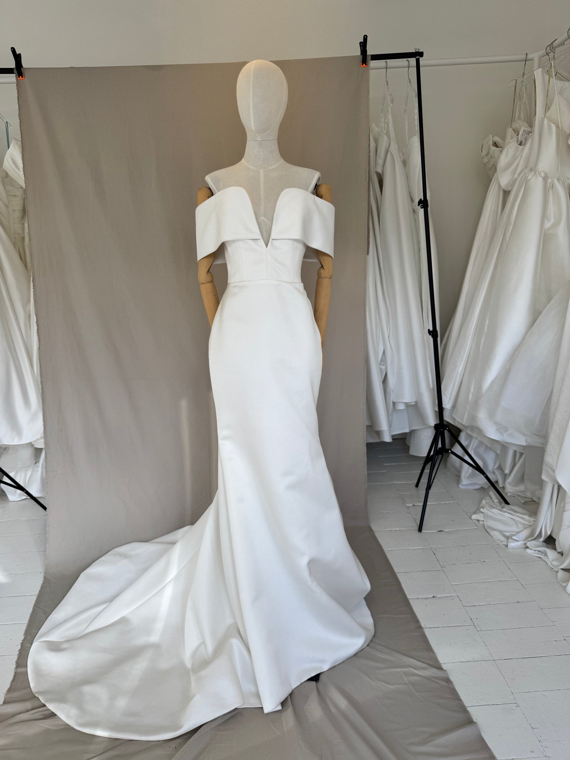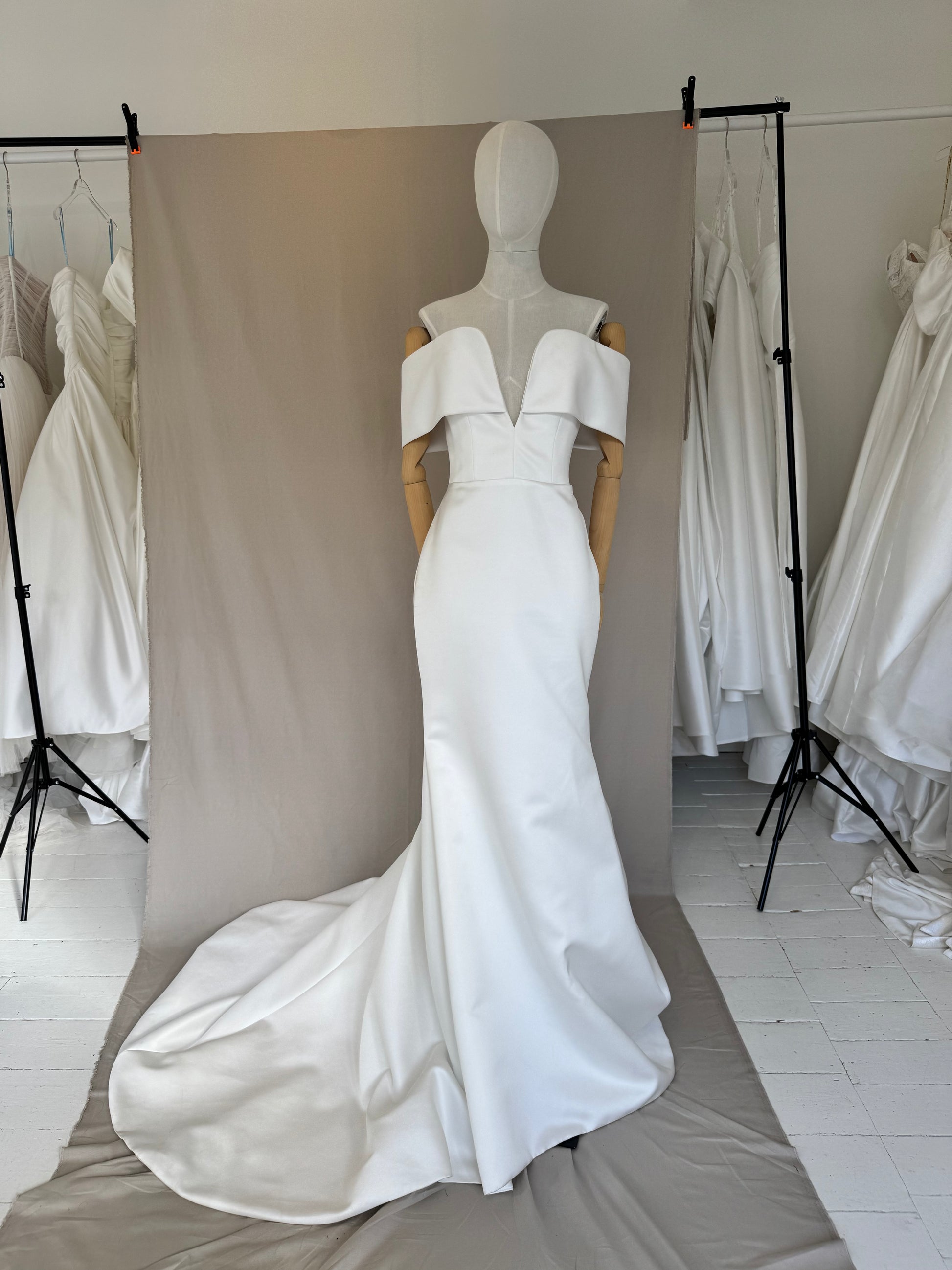 Move over screen sirens, Berkeley has arrived. Perfect for a statement red carpet or walk down the aisle, to Berkeley's deep v neckline, off shoulder arm band detail and fit and flare skirt will steal every scene. Pair with the Echo skirt for level-up drama.