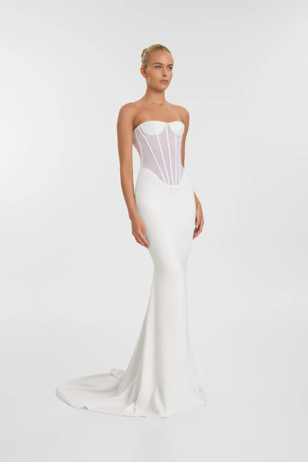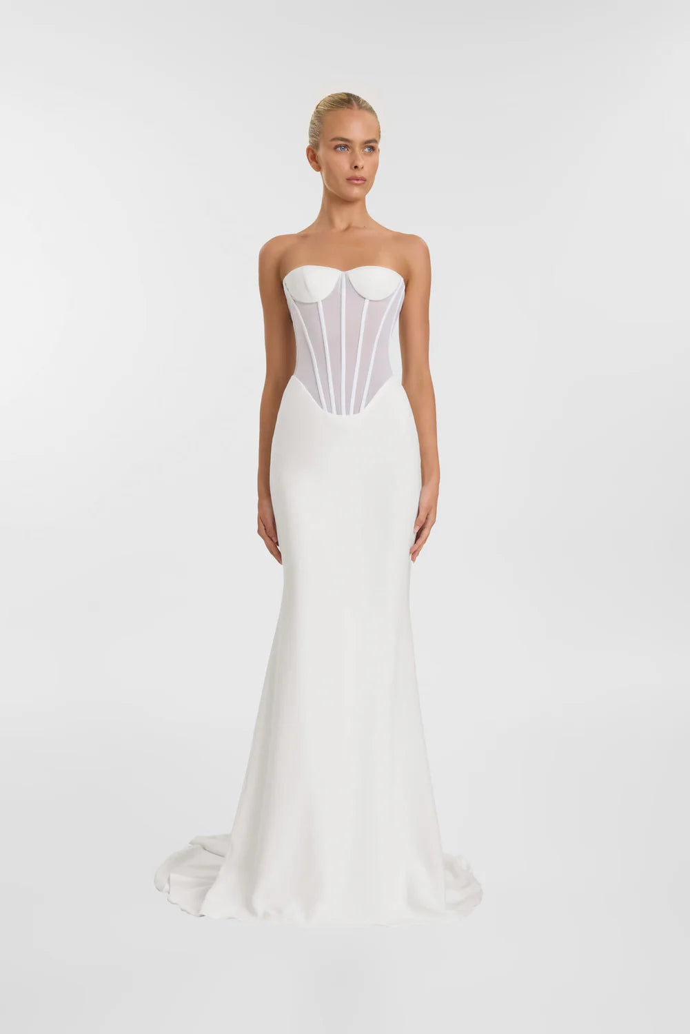 FIT: Demi cup crepe gown with straight neckline, dipped waist and exposed boning detail through bodice. Fit and flare skirt.