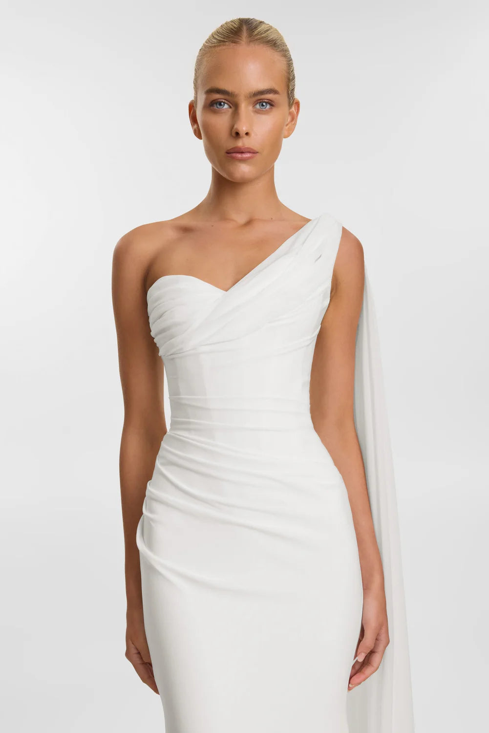 FIT: Draped fit and flare gown with sweetheart neckline, structured bodice and chiffon scarf on left hand side.