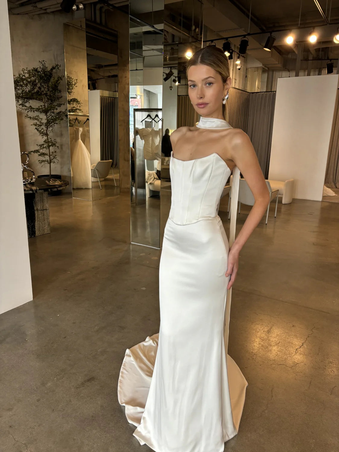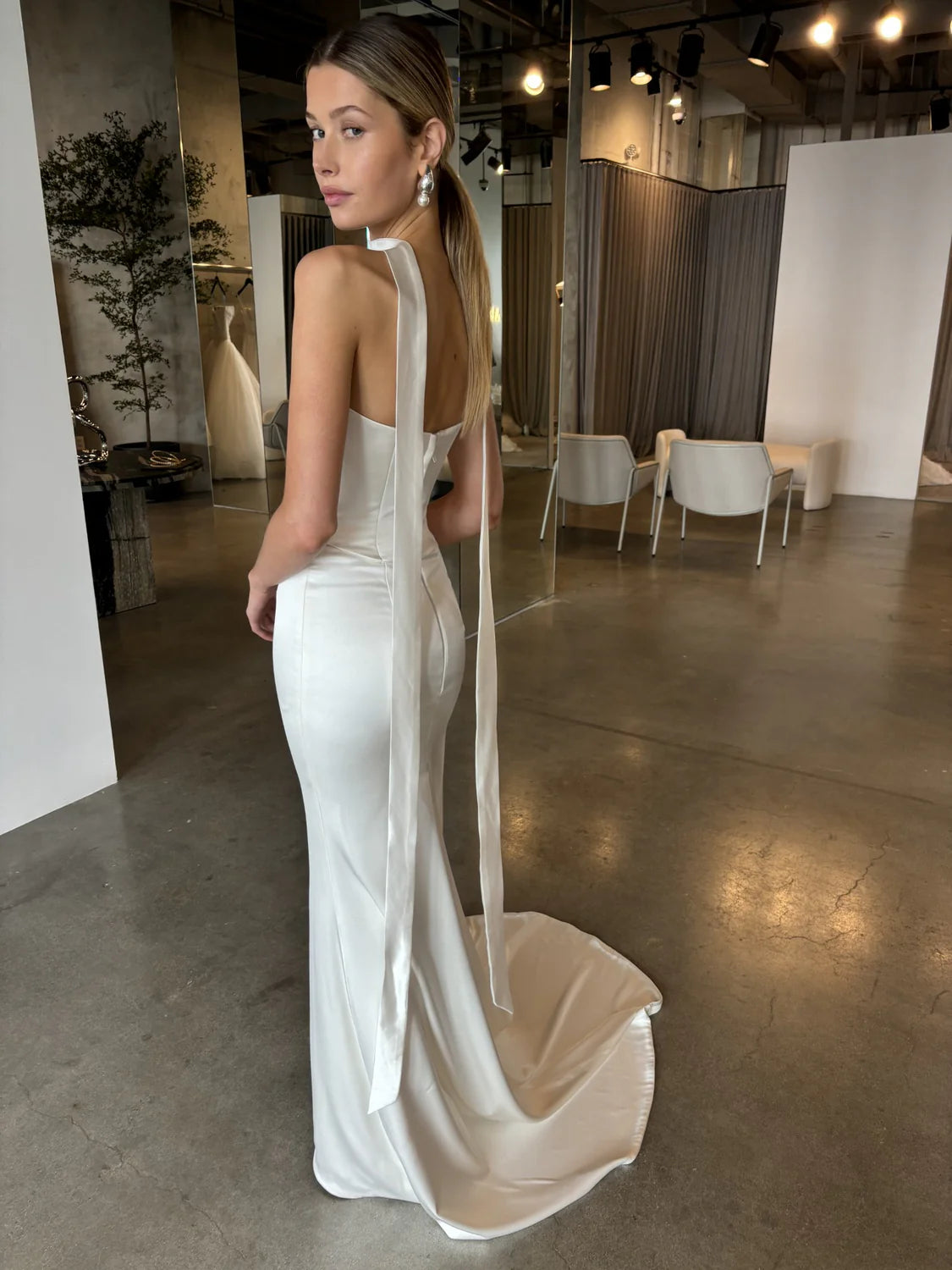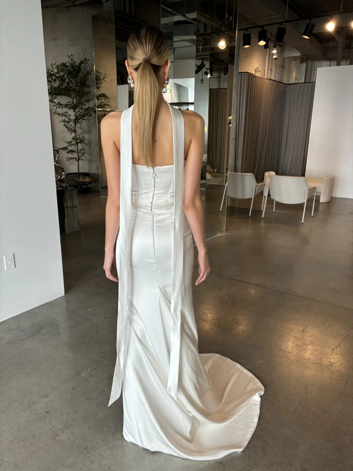 The bridal necktie is a chic and unconventional accessory that has gained popularity as a modern addition to bridal ensembles. Sali is crafted from satin tractate or Crepe tractate to complement multiple Chosen by Kyha gowns including Salacea or Duke. However the Sali necktie can be styled with gowns from other designers. Sali just completes that old money, timeless Hollywood style that the modern bride embodies.