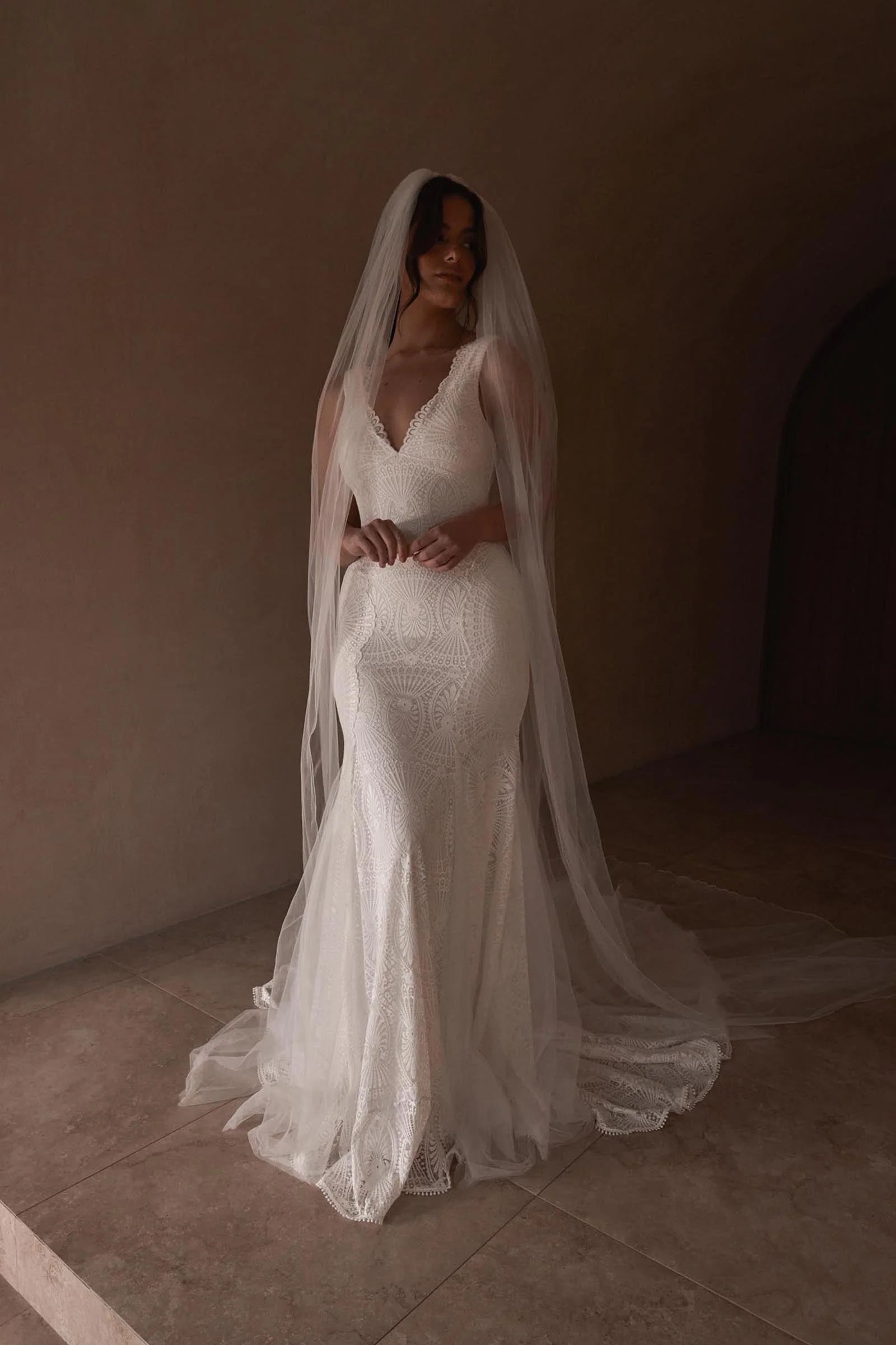 Dreamlike and pure, Sienna is an ode to the ultimate romantic. Crafted from 100% recycled lace, this eco gown embellishes textural elegance, with a thoughtful interpretation of a traditional bride.