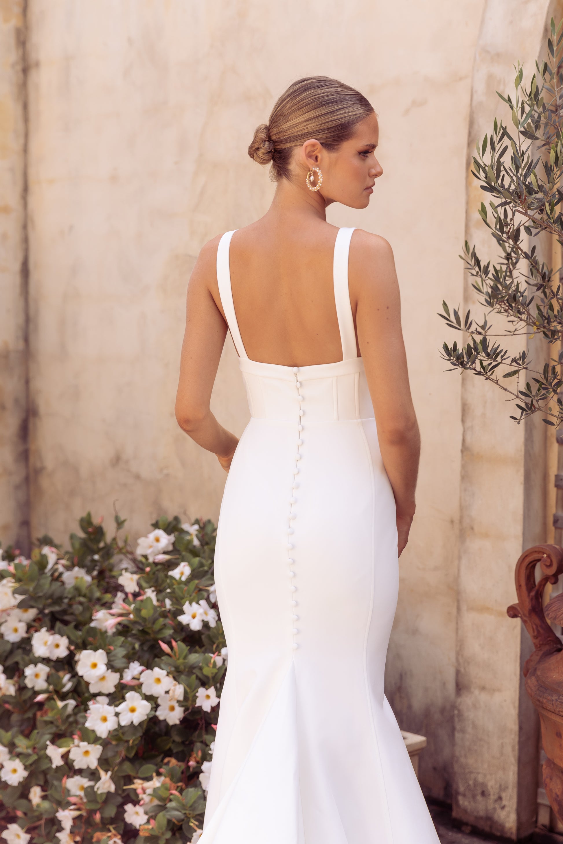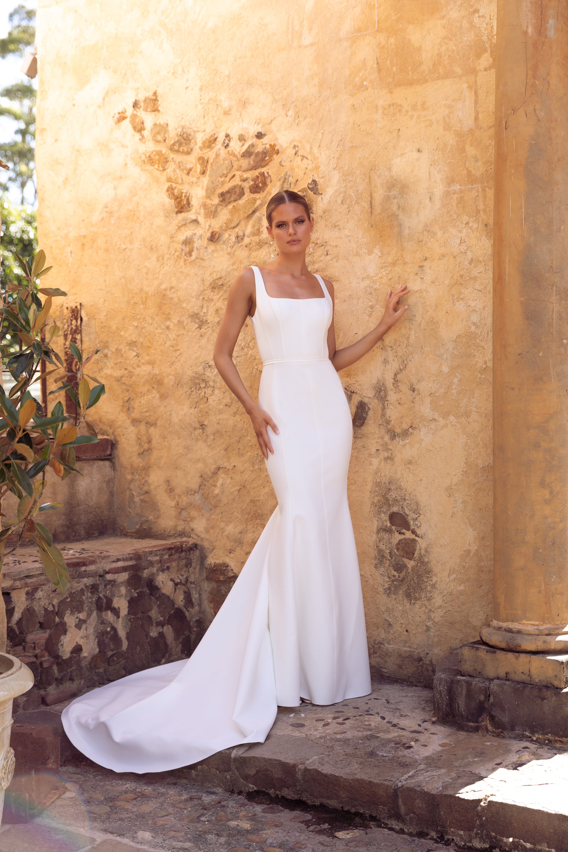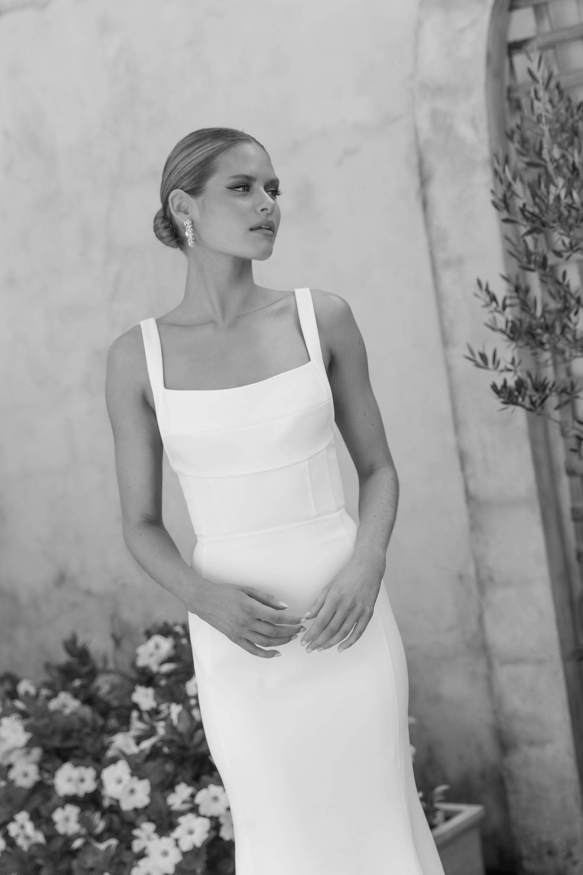 DESCRIPTION: Tommie is part of the Midnight Soiree collection. It is a simple crepe square neckline dress with a structured boned bodice. Although simplistic in it's design, it is very striking with 90's style strap and slightly curved neckline. Tommie's crepe is strong enough to hold the body for a comfortable and elegant look.