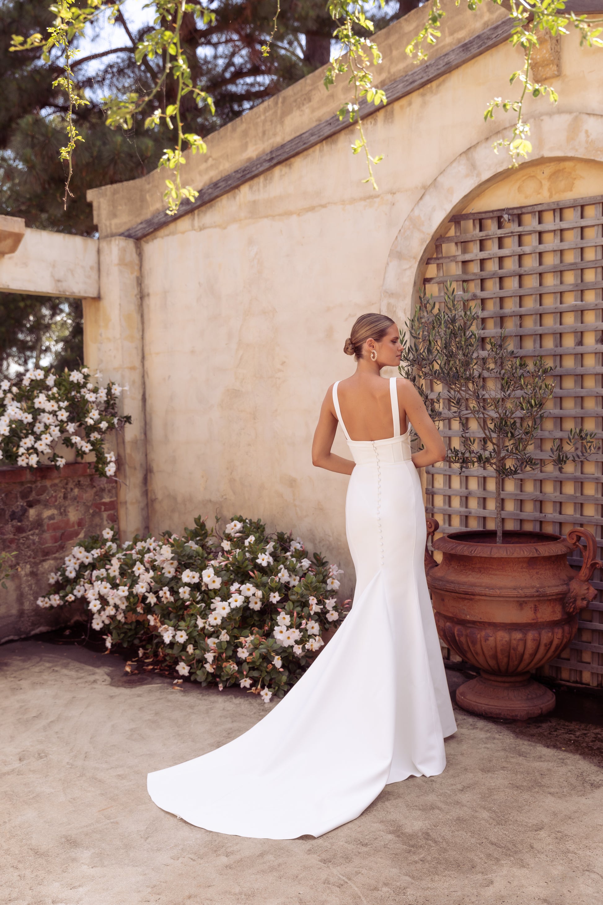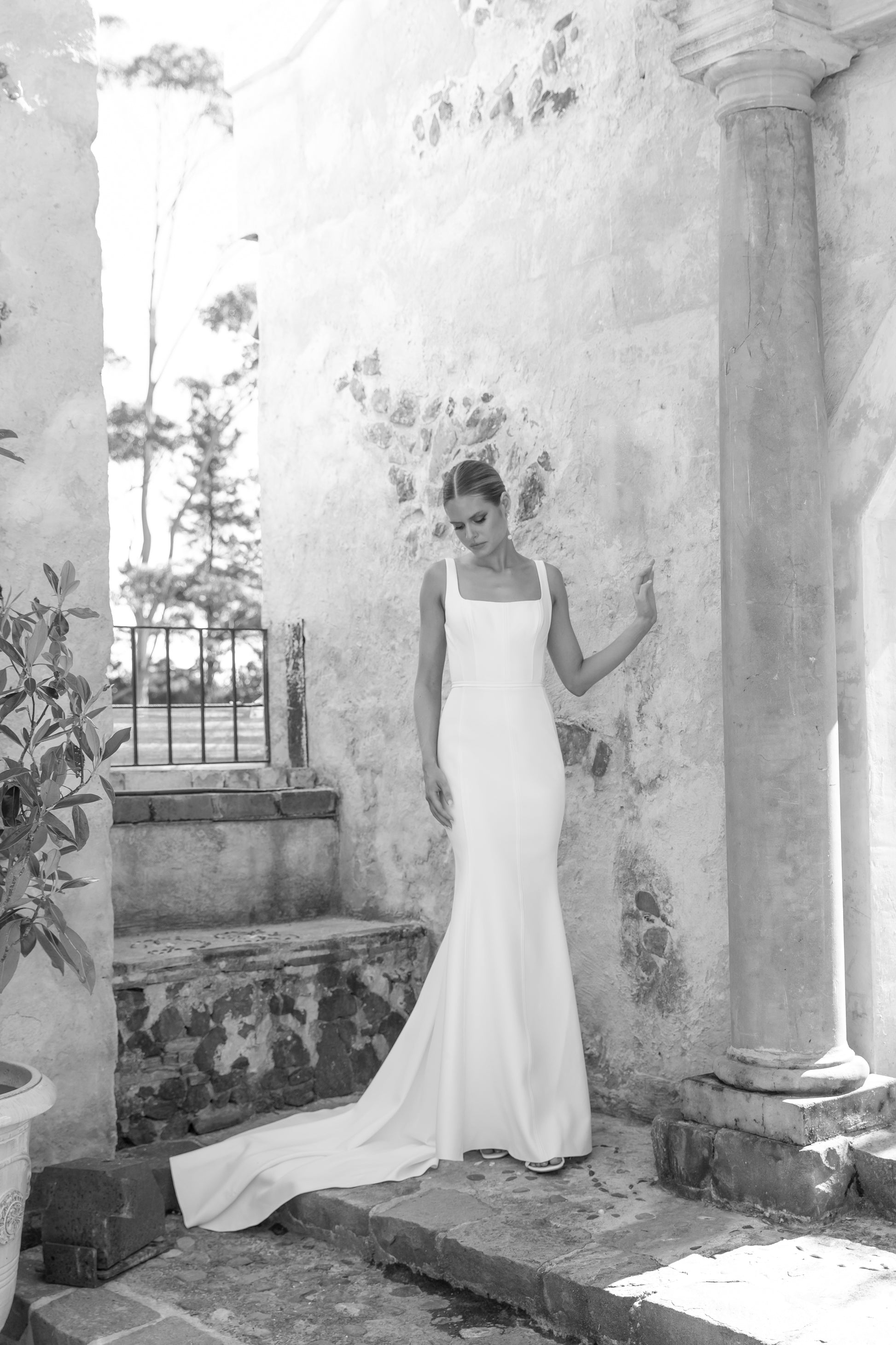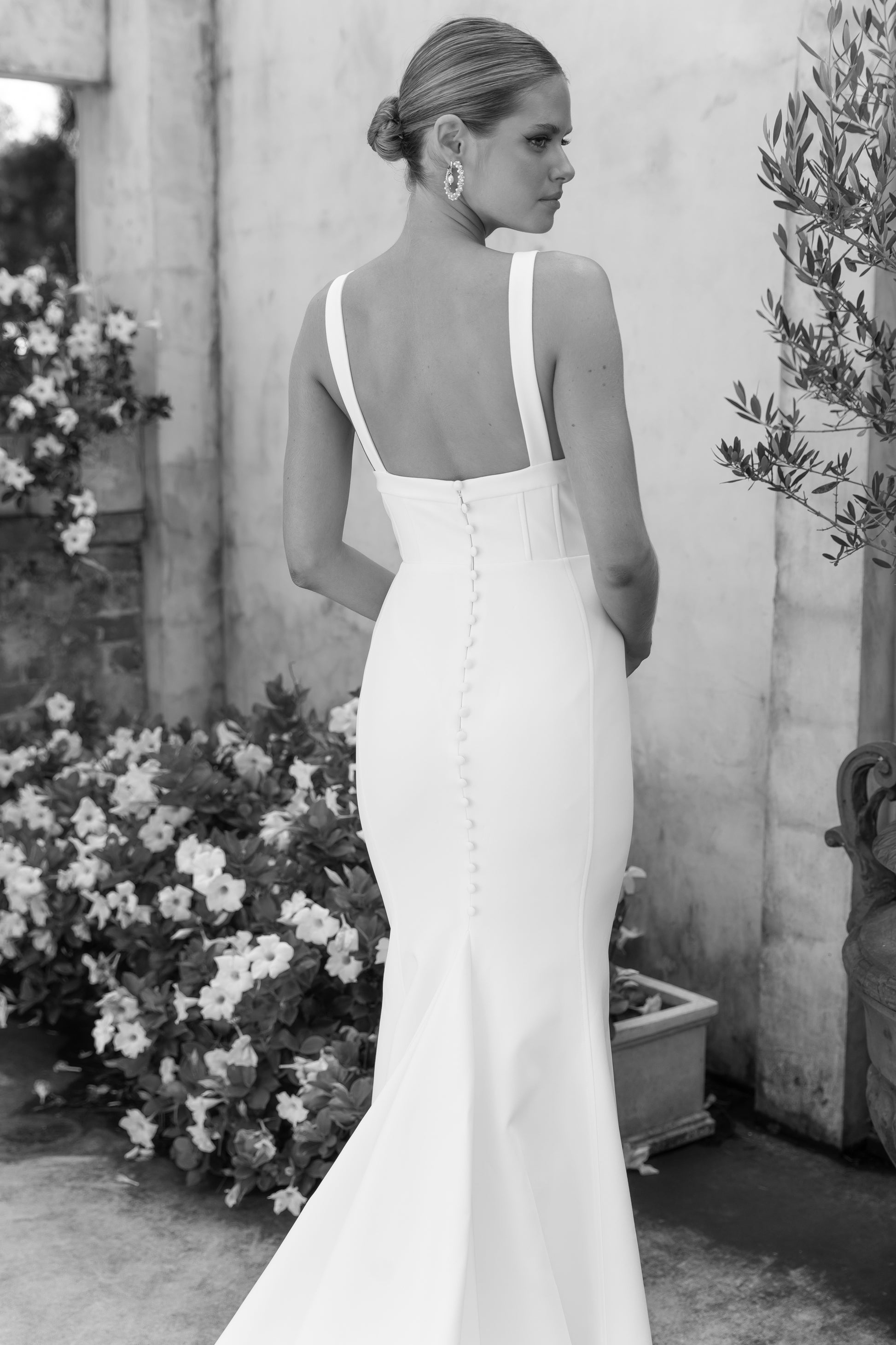 DESCRIPTION: Tommie is part of the Midnight Soiree collection. It is a simple crepe square neckline dress with a structured boned bodice. Although simplistic in it's design, it is very striking with 90's style strap and slightly curved neckline. Tommie's crepe is strong enough to hold the body for a comfortable and elegant look.