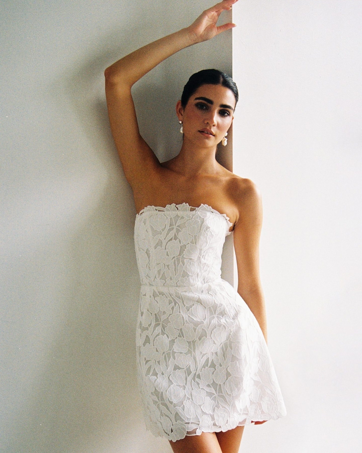 The Amanda dress is a wearable garden party. Cut in our beautifully textured new tulip floral cutout fabric, in a flirtatious mini silhouette, she’s a perfect choice for any of your bridal events.