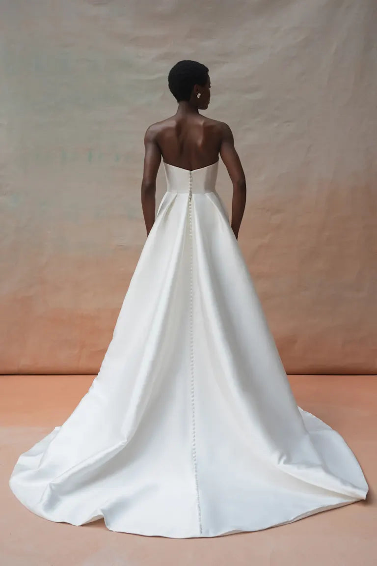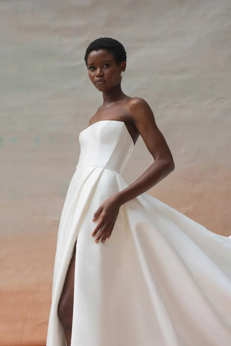 The Catherine gown takes a modern approach to old Hollywood glamour. Cut in our luminous sleek Mikado fabric, she features a sharp straight neckline, sculpted clean bodice, and sweeping ball skirt with a sultry slit. Angled pleat details add volume and interest to the dramatic skirt.