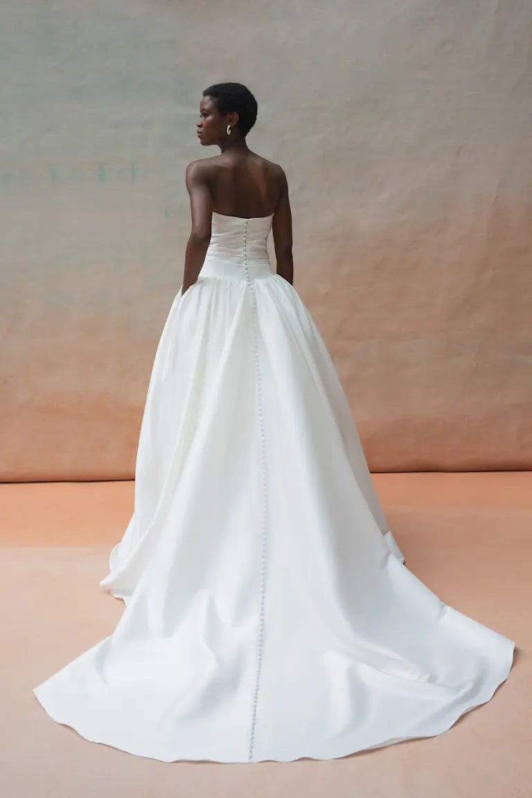 The Charlotte gown by Jenny Yoo is a timeless and elegant wedding dress crafted from light and lustrous luxe taffeta fabric. It features a plunging V-neckline that leads to a gathered bodice with a flattering drop waist, creating a sophisticated silhouette. The full ballgown skirt is designed for dramatic flair and includes side seam pockets, adding a modern touch to the classic design. The gown is completed with an open square back and a sweeping cathedral train, ensuring a memorable entrance.