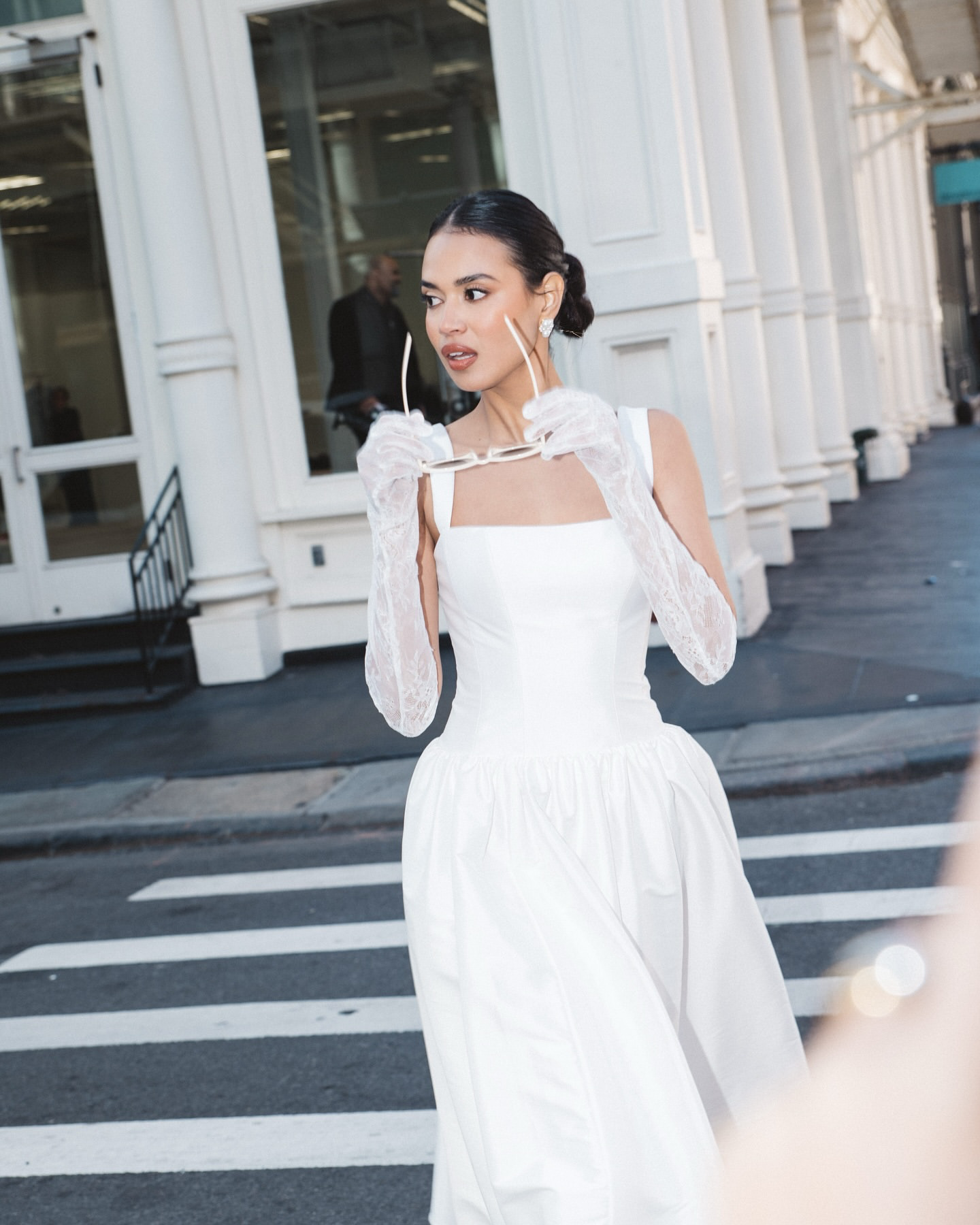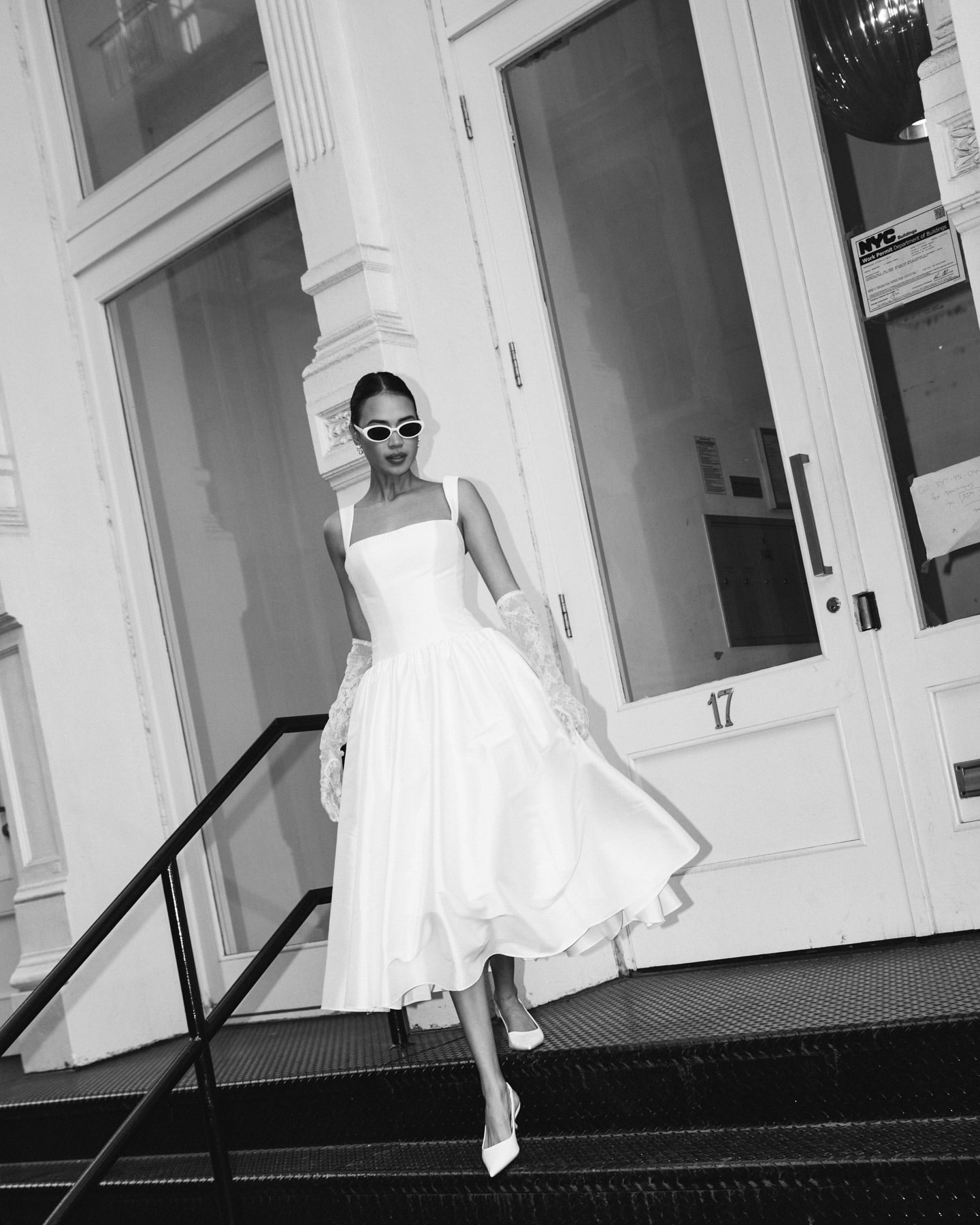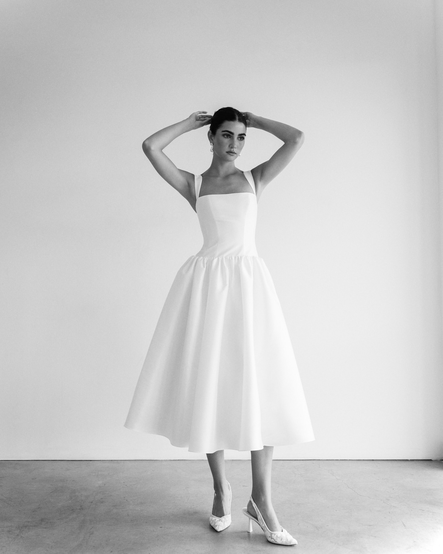 Feel like a modern day Audrey Hepburn in this beautifully classic little white dress. Cut in our lustrous and lightweight Luxe Taffeta fabric, the structured bodice shapes your silhouette, while the full skirt was just made for twirling.