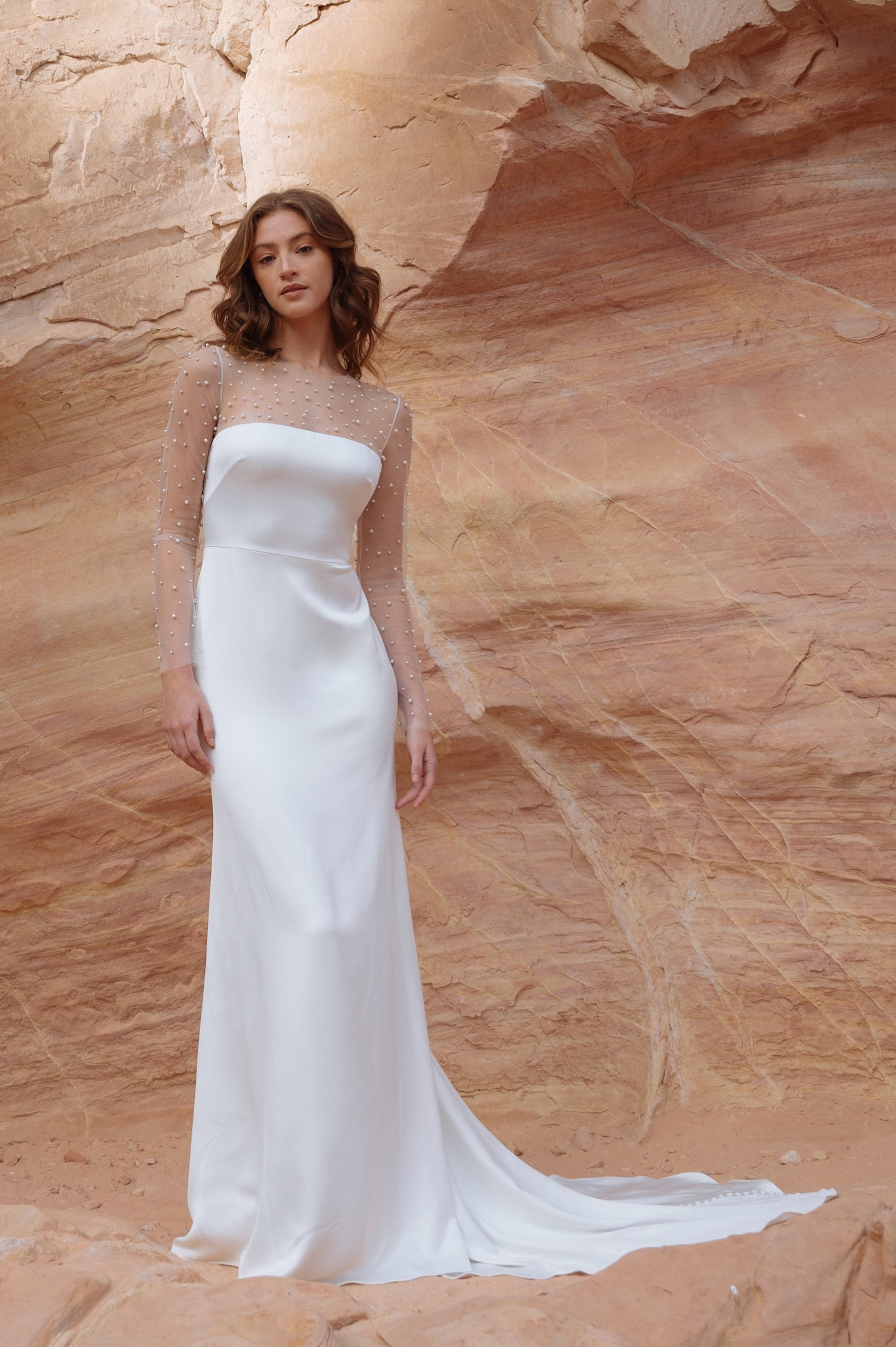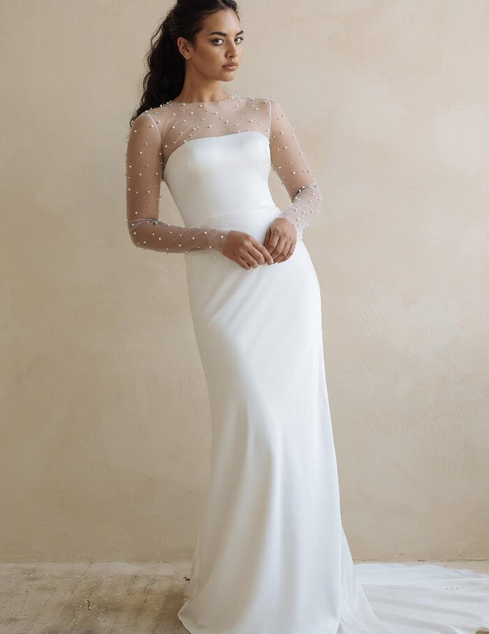 The Morgan gown feels truly modern, with thoughtful details added for a timeless effect. The sleek, chic straight neckline is balanced by a sheer illusion sleeve and neckline dotted with everyone’s favorite bridal accessory, pearls.