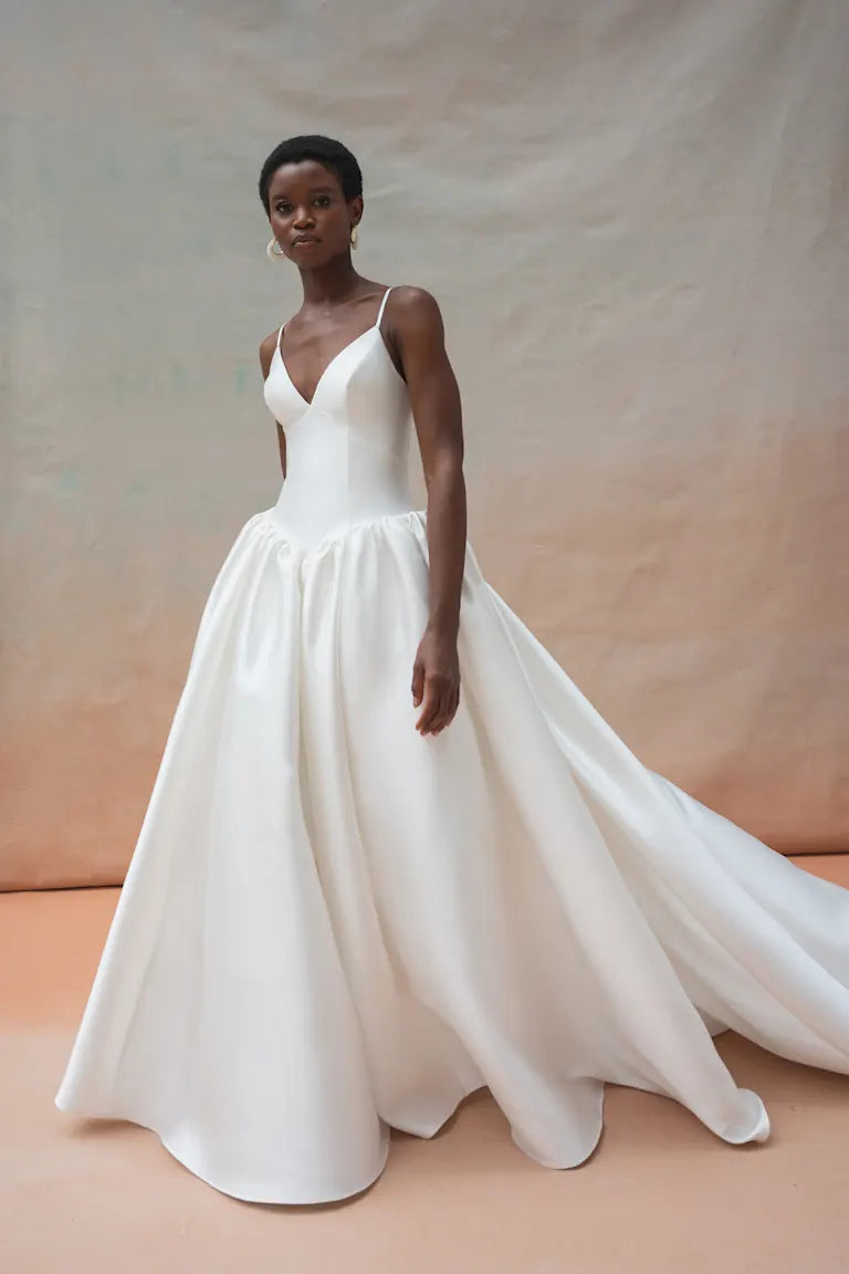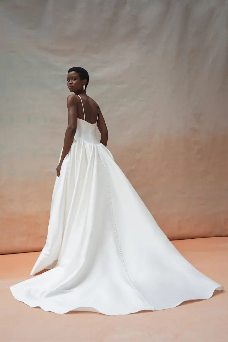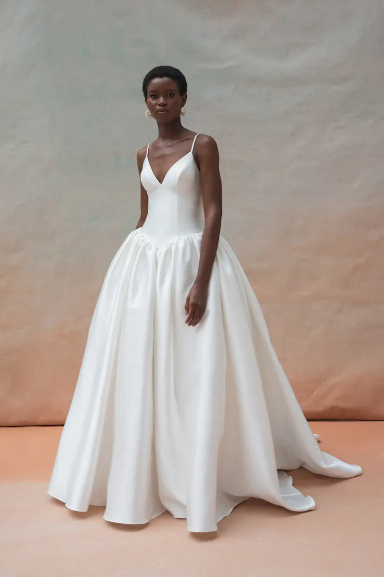 Cut in our incandescent sleek Mikado fabric, with clean, chic style lines, the Shay gown is a fresh take on a classic Basque waist gown. Delicate spaghetti straps support a modern V neck with an empire waist seam while princess seams sculpt the bodice beautifully. The gathered ball skirt has side seam pockets for a playful yet useful detail.