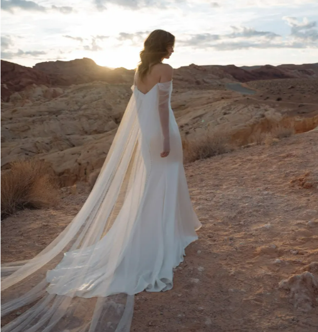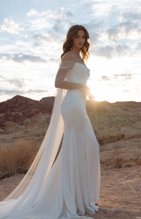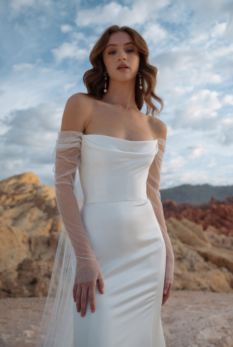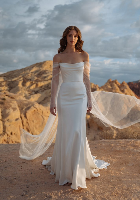 Modern details elevate and update the otherwise timeless silhouette of the Olivia gown. Cut in our elegantly fluid luxe satin fabric, the draped cowl bodice lead way to a sheer off the shoulder sleeve. Curved princess seams sculpt the fit and flare skirt, and detachable tulle streamers lend a hint of whimsy.