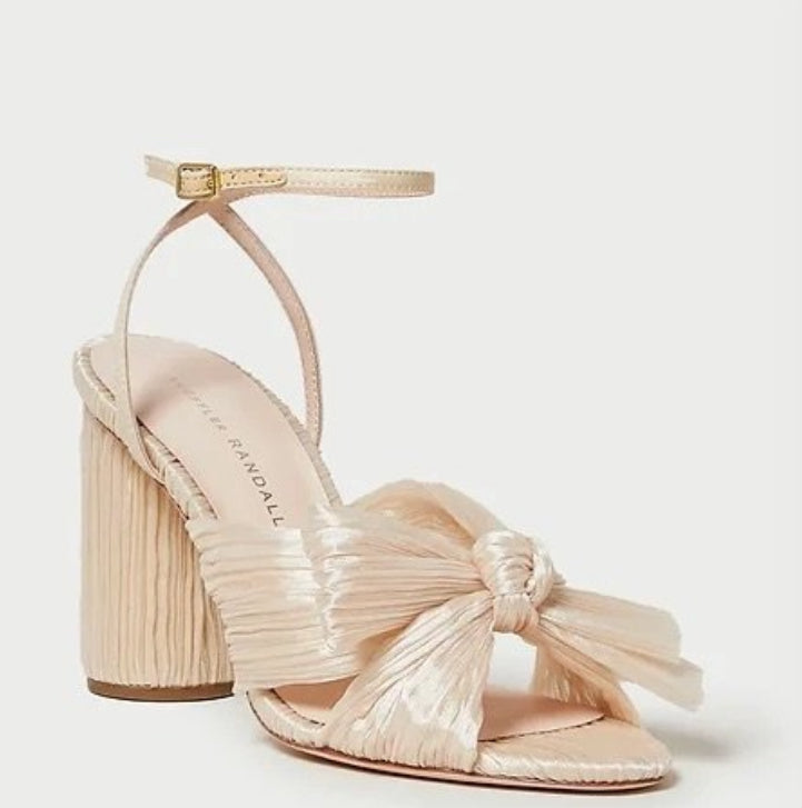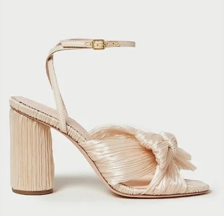 Pleated heeled sandal in a Almond colour fabric with our signature knotted bow. Features a padded footbed with gold stamped logo. Open toe with adjustable buckle ankle strap. 3.5 inch heel. Camellia runs slightly small. For narrow feet, we recommend sizing up a 1/2 size. For wider feet, we recommend sizing up 1 size.