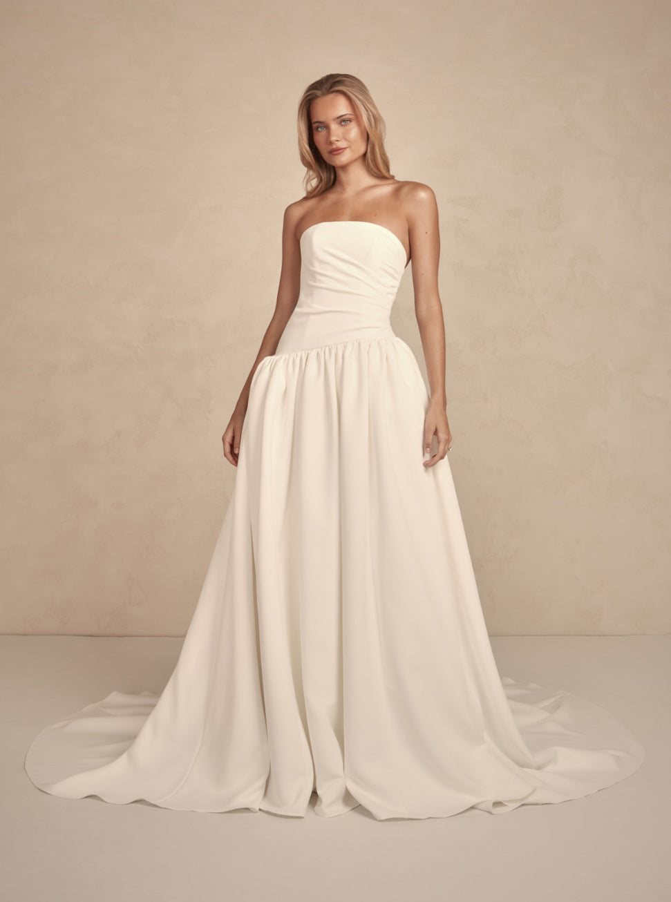 Avery is a celebration of modern romance and clean design, crafted from our all-new light yet structured satin. Her strapless bodice features soft, asymmetrical pleating that contours and defines, offering both support and elegance. The dropped waistline flows into a full, gathered skirt that moves with graceful ease, creating a silhouette that feels both classic and fresh.
