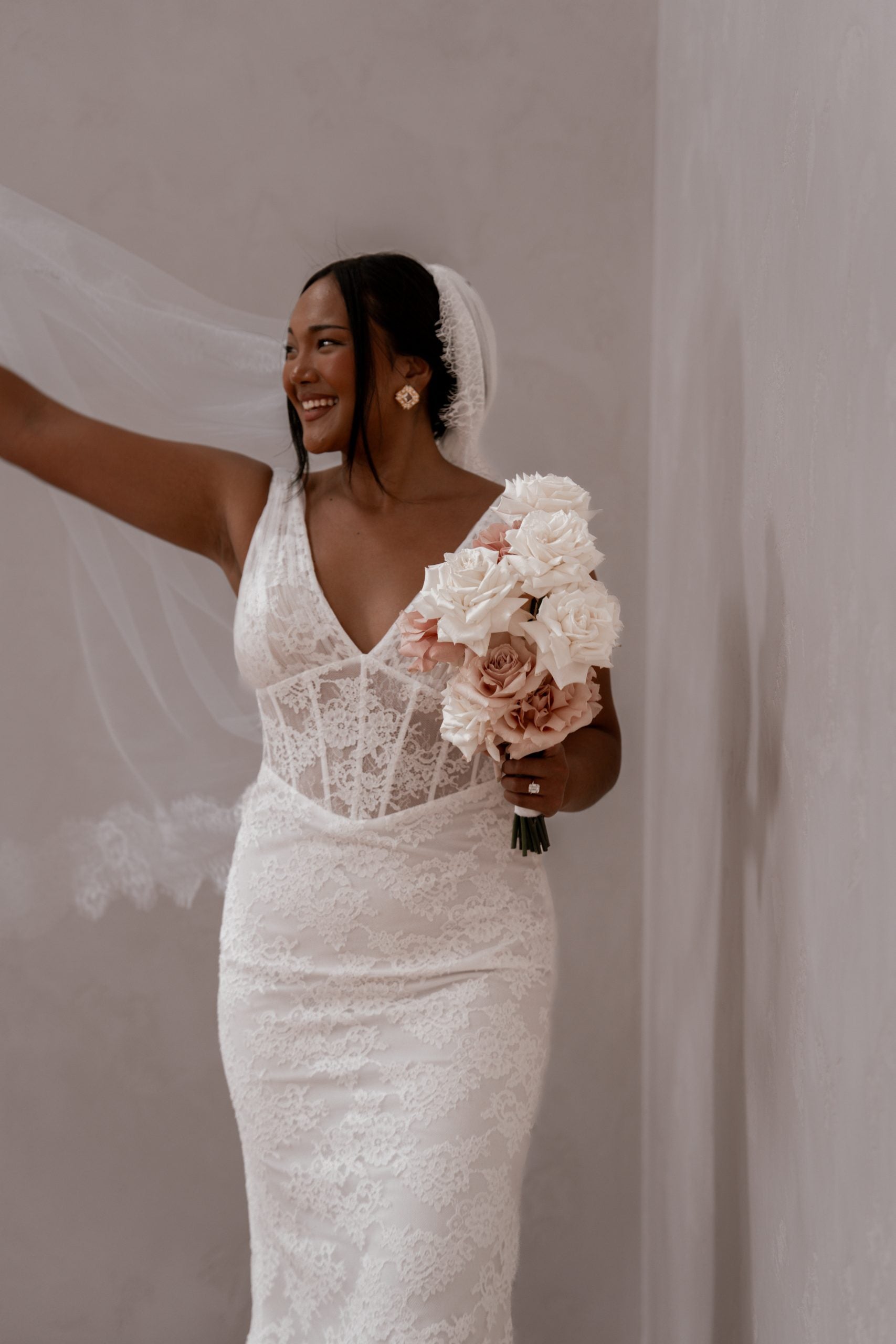 Live out your lace dreams in our drop-dead gorgeous Frances. Featuring a delicate floral lace, a soft pleated tulle bust and intricate boning to accentuate the waist and frame the feminine figure, Frances is a work of art as much as she is our dream wedding gown.