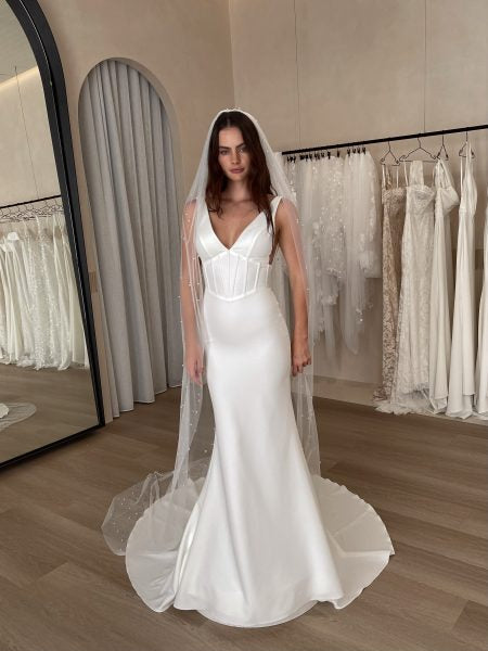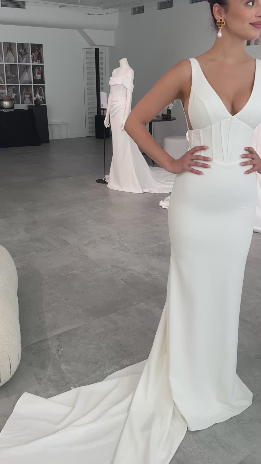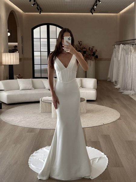 Frances features a subtle basque waistline, flattering square back and hand-sewn buttons to the godet. Her timeless crepe lace makes a flawless feature in her stunning bodice panel and train that is perfectly polished with an eye-lash trim at the hemline.