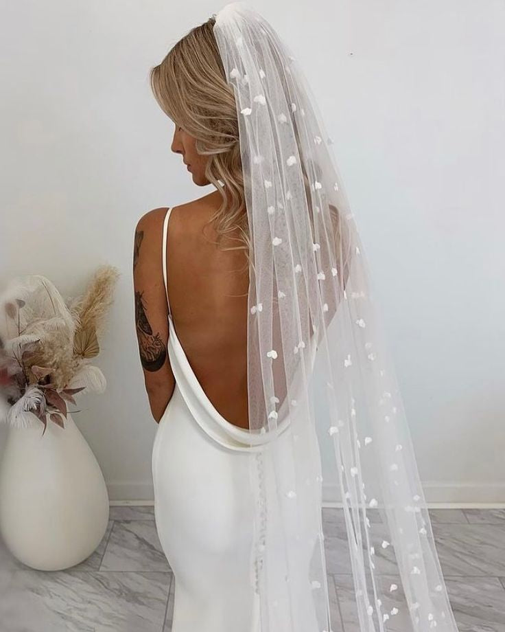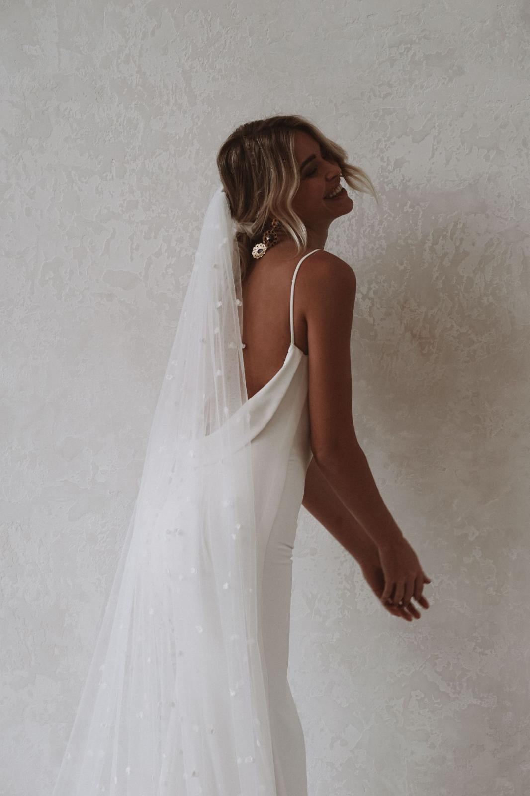 Our Harlow Veil is a single layer, 3m cathedral length veil with 3D flutters from the gorgeous Harlow lace. She is the perfect match for our Harlow dress along with all of our beautiful crepe dresses. The Harlow Veil comes attached to a comb so it can easily be placed on your hair.