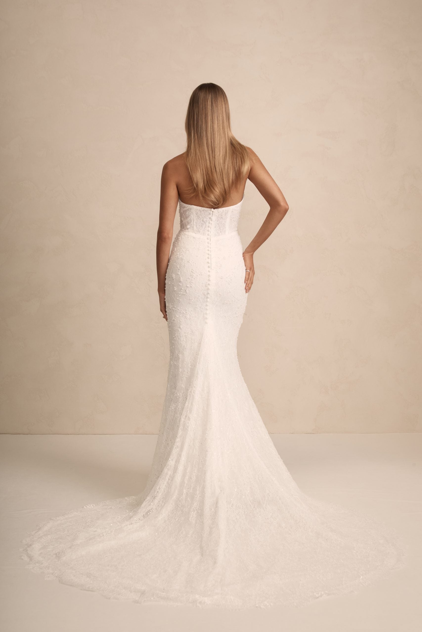The 'Haven' gown from Made With Love Bridal's Reina collection is a fitted, figure-flattering design with a beautifully structured basque drop waist. The gown features elegant ruching over the hips, enhancing the feminine silhouette and creating a smooth, graceful effect. The gown is crafted in a luxurious ivory fabric and showcases a stunning square neckline that adds a modern touch to its classic design. The bodice is adorned with intricate beaded Chantilly lace, adding texture and sparkle to the look. For an added layer of sophistication, Chantilly lace sleeves are available for purchase separately, offering the option to personalize the gown further. The overall effect of the 'Haven' gown is a delicate yet bold statement of bridal beauty.