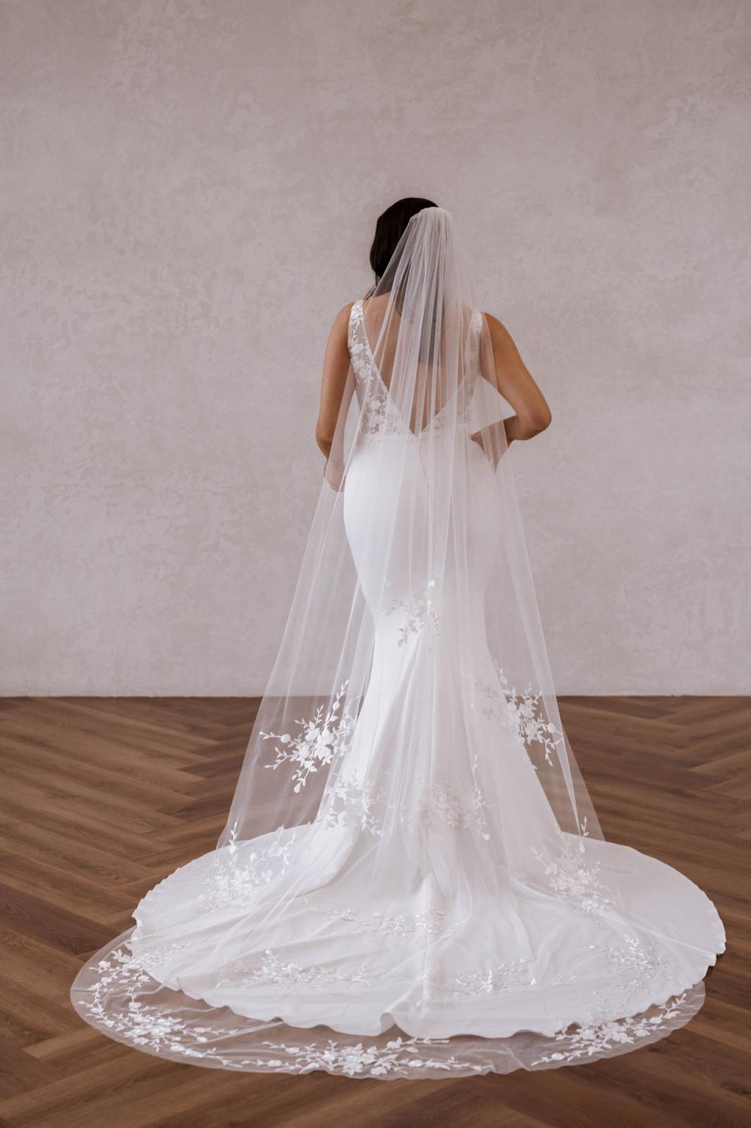Our gorgeous Jack Veil features beautiful Jack lace appliqued onto 3m of our soft ivory tulle, outlining the hem and trickling down from the center of the veil. She pairs perfectly with our Jack, or any of our timeless French Crepe designs for a touch of extra beauty and luxury.