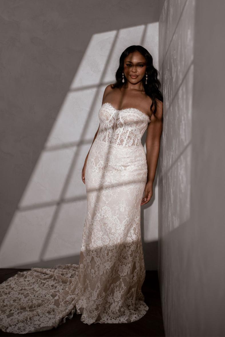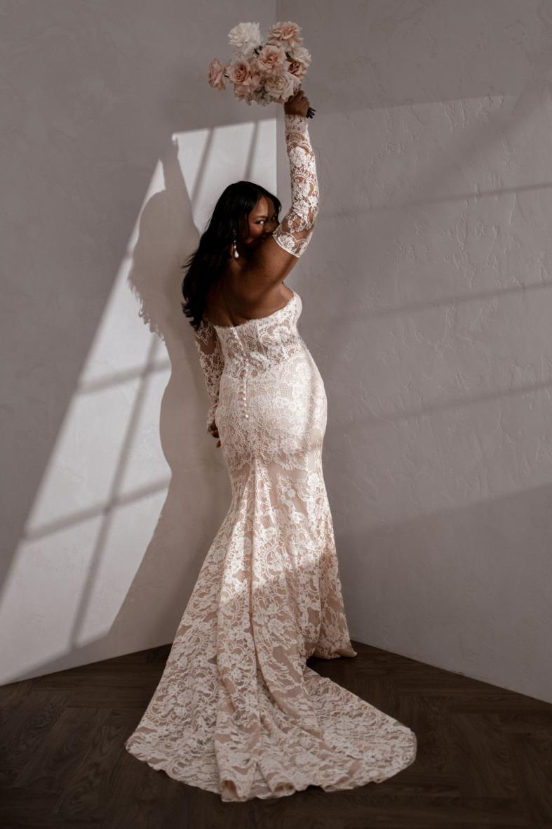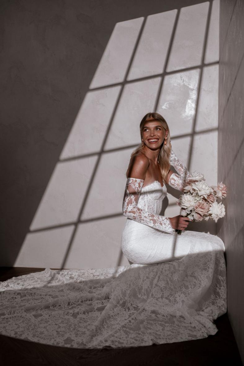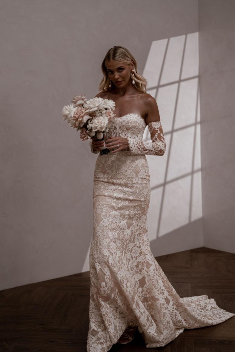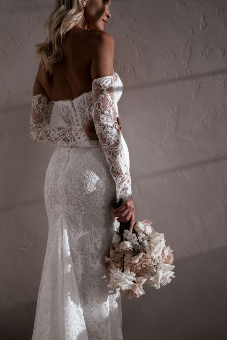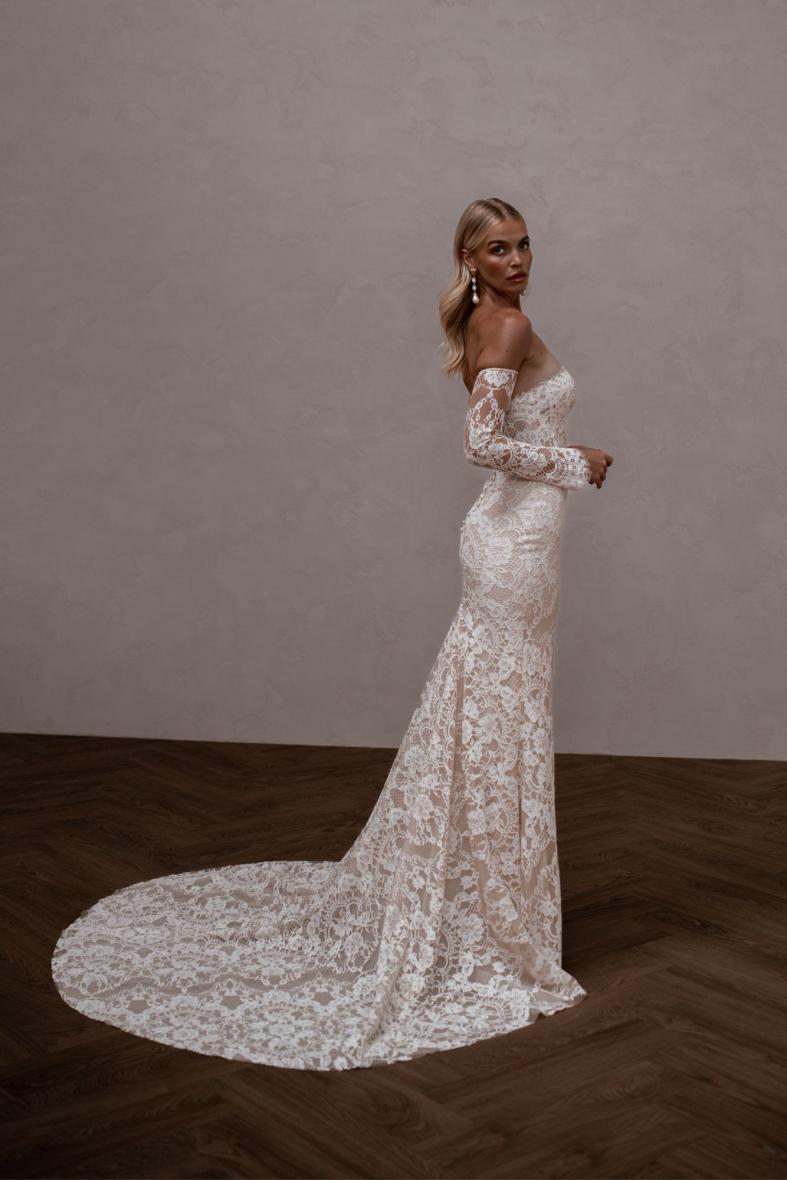 Winnie presents an impossible decision, as she is available in both our exclusive sand and traditional ivory colourways. Her intricately beautiful Chantilly lace with stunning eyelash edges truly shines, regardless of the selected undertone. Paired with her sheer removable sleeves and contouring bodice boning, she is a beauty that is sure to endure the test of time, giving a nod to tradition, yet fiercely embraces modern trends.
