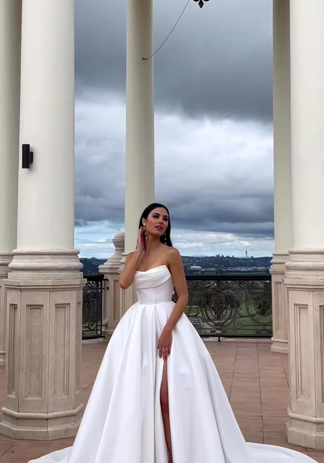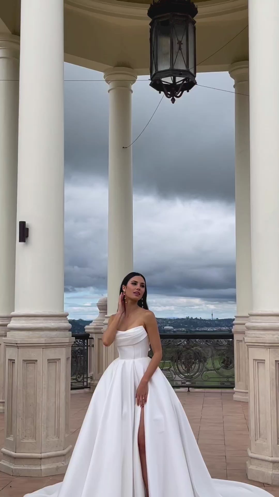 The dress that went viral on Tik Tok with over 16 million views! You’ll be sure to turn heads in our Avery gown, a versatile mikado satin gown that can be worn strapless or with thin detachable straps allowing you to change up your look. Avery features a ruched scoop neckline and exposed boning throughout the bodice including a sheer mesh panelled back. Avery is complete with its statement skirt which has a modern leg split and a long train for added drama. Avery is our take on the modern ball gown